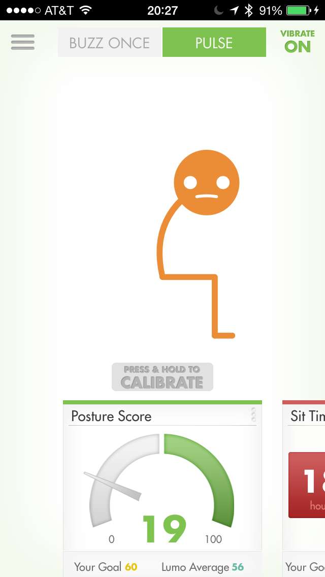 종종 자세 측정이 잘못되는 경우가 있는데 중간의 CALIBRATE 단추를 누르고 똑바른 자세를 취하면 그 자세 기준으로 조정이 됩니다.