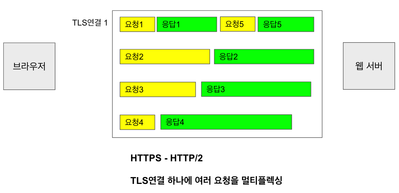 HTTP/2의 멀티플랙싱의 경우는 아래 그림처럼 하나의 TLS연결에 여러개의 요청을 넣어서 보낼 수 있습니다. 실제로는 적절한 크기의 프레임 단위로 각 요청과 응답을 나누어서 보내게 됩니다.